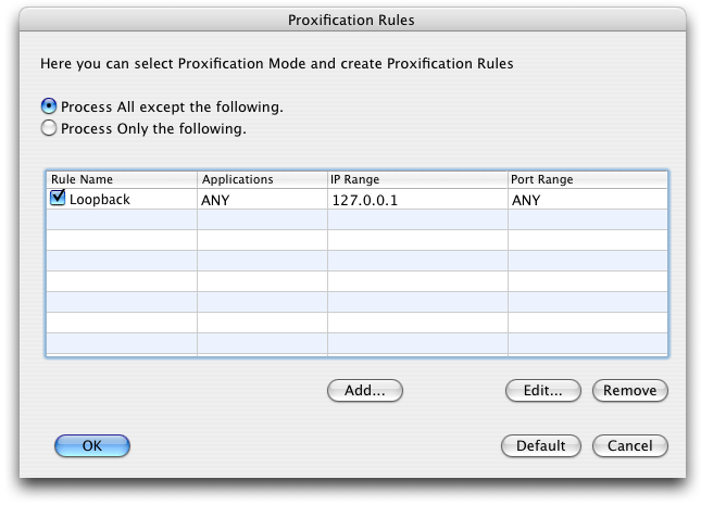 This feature allows you to specify the connections that should be proxified. The rules can be based on target IP addresses, port numbers and application names. Warning: Whenever you are using any kind of local proxy server (IP 127.0.0.1) e.g. Tor, Privoxy and etc, they should not be proxified. They should be explicitly ignored when configuring as "Process All except the following" or not entered when configuring as "Process Only the following." To access this feature please click Proxification Rules in the Options menu. The following dialog window will appear: